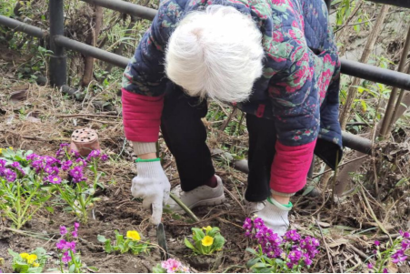 随后,志愿者与老人们一同种花,通过园艺活动增进代际交流,同时绿化社区环境,为居民生活增进一抹绿色。志愿者们先耐心地为老人们详细介绍各种花卉的特点、种植方法以及各种工具的使用方式,然后和老人们一同动手参与种植,整个过程轻松愉悦,大家都得到了身心的放松。