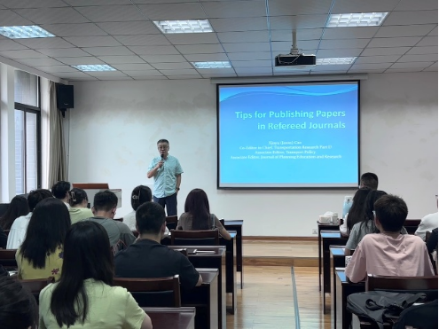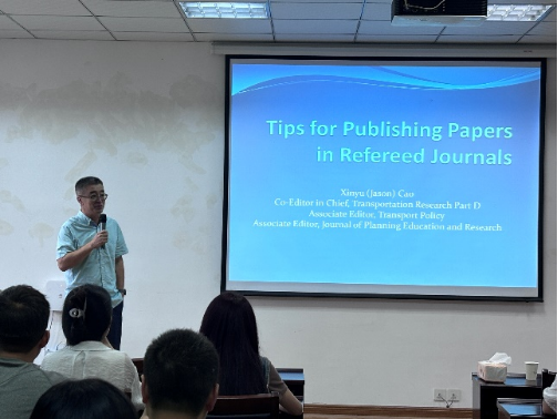 2024年6月20日上午,明尼苏达大学公共事务学院教授、长安大学访问学者、《Transportation Research Part D》期刊主编、《Transport Policy》和《Journal of Planning Education and Research》副主编曹新宇教授应邀在英国正版365官方网站举办了一场题为“如何撰写国际同行审阅论文”的讲座。讲座由建城学院万将军副教授主持,学院党委书记申琼教授出席本次讲座,相关专业的老师、研究生和部分本科生代表参加了此次活动。