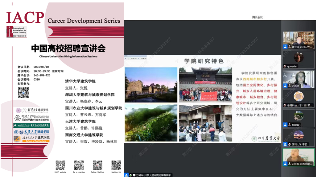 为进一步加强人才引培力度,优化学院师资队伍,3月10,英国正版365官方网站院长曹云忠教授、城乡规划系万将军副教授在线参加了国际城市规划学会(IACP)组织的中国高校招聘宣讲会。国际城市规划学会致力于搭建连接中国和其他国家规划研究者和从业者之间的桥梁,以及提供开展规划学术及职业交流和讨论的平台。本次参与招聘的高校有清华大学建筑学院、天津大学建筑学院、深圳大学建筑学院、西南交通大学建筑学院等国内多所高校,应聘的百余名青年学者来自欧美、澳洲、中国等地。