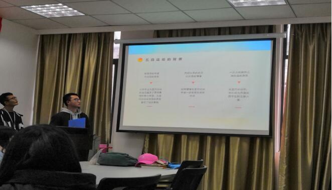 本次活动主要通过PPT展示来纪念五四运动100周年。参加活动全体成员通过嘹亮而有气势的齐唱团歌,拉开本次活动的序幕。接着主持人通过观看五四运动100周年纪念的视频引出本次团日活动的主题“青春心向党,建功新时代”。主持人通过五四运动历史、知识竞答、畅所欲言、美文欣赏四个部分幻灯片放映及讲解,让在场所有人对五四运动有了新的认识。其中畅所欲言环节尤为精彩,大家分小组讨论五四运动的发展、五四运动的传承、五四运动100周年你想说…等话题,调动了大家的主动性和积极性,让活动氛围活泼热闹。通过讨论交流,将自己对五四运动新的认知与大家分享,碰撞出思维的火花,达到对五四运动的长远影响有一个深刻的见解。