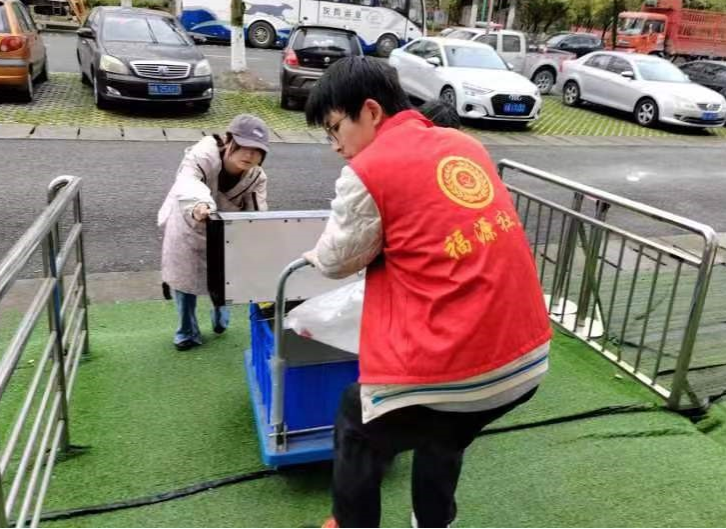 图为志愿者协助搬运敬老院物资