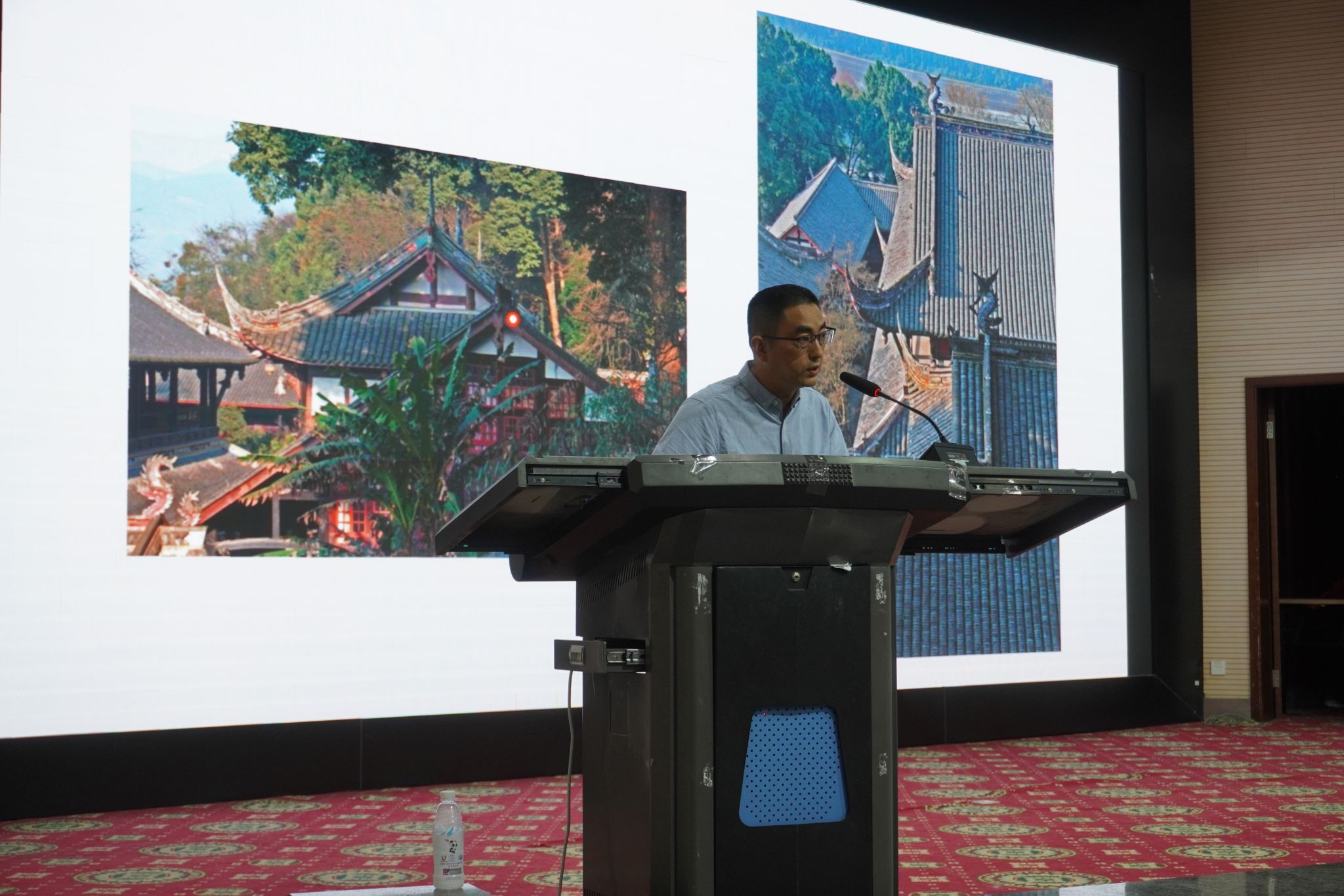 随后,付三云以都江堰多个古建筑为例进行了建筑美学分析,重点讲解了位于离堆公园里的清溪园和二王庙。清溪园是园林建筑,三面环绕,以拾石阶和飞动的画卷相连,尽显建筑之古朴,工艺之精美。与其不同的是著名景点二王庙,建筑群屋顶虽为歇山式结构,但大殿屋顶却采用了双脊天沟的设计,整个屋顶从侧面看,呈“M”形状。这一设计,使大殿与整个建筑组群和谐统一,与玉垒山浑然一体。生动典型的古建筑案例让同学们更加直观地了解古建筑中蕴藏的智慧,现场观众纷纷表示受益匪浅。都江堰市一名本地学生在听完讲座后,激动地说:“原来我居住的地方,蕴含了这么多历史文化。”