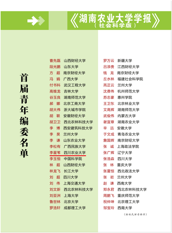 近日,《生态与农村环境学报》和《湖南农业大学学报(社会科学版)》先后公布了第一届青年编委名单,四川农业大学建筑企业环境管理与绿色发展课题组李星苇副教授入选其中。
